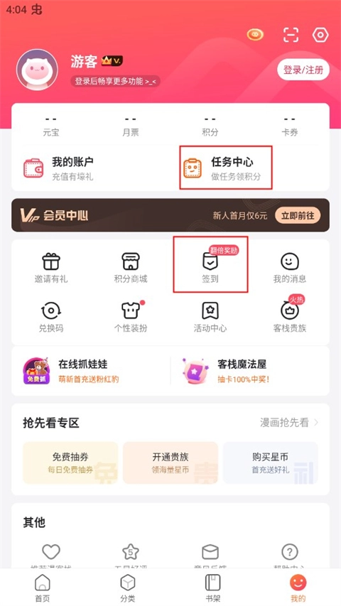 每周畅享福利体验,阅读追书一路畅行无阻!每日完成轻松任务,即可领取积分,热门游戏皮肤等丰厚壕礼领到手软!