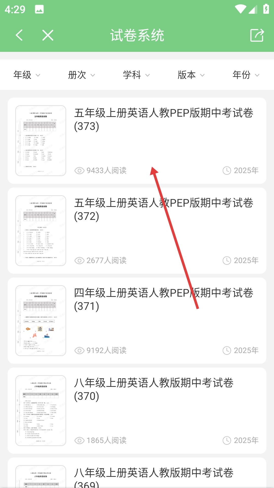 2、在试卷系统页面选定目标试卷,例如【五年级上册英语人教PEP版期中考试卷(373)】。