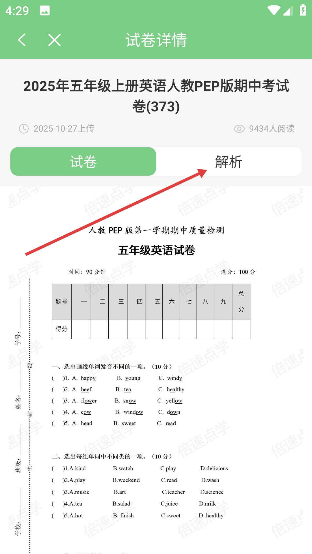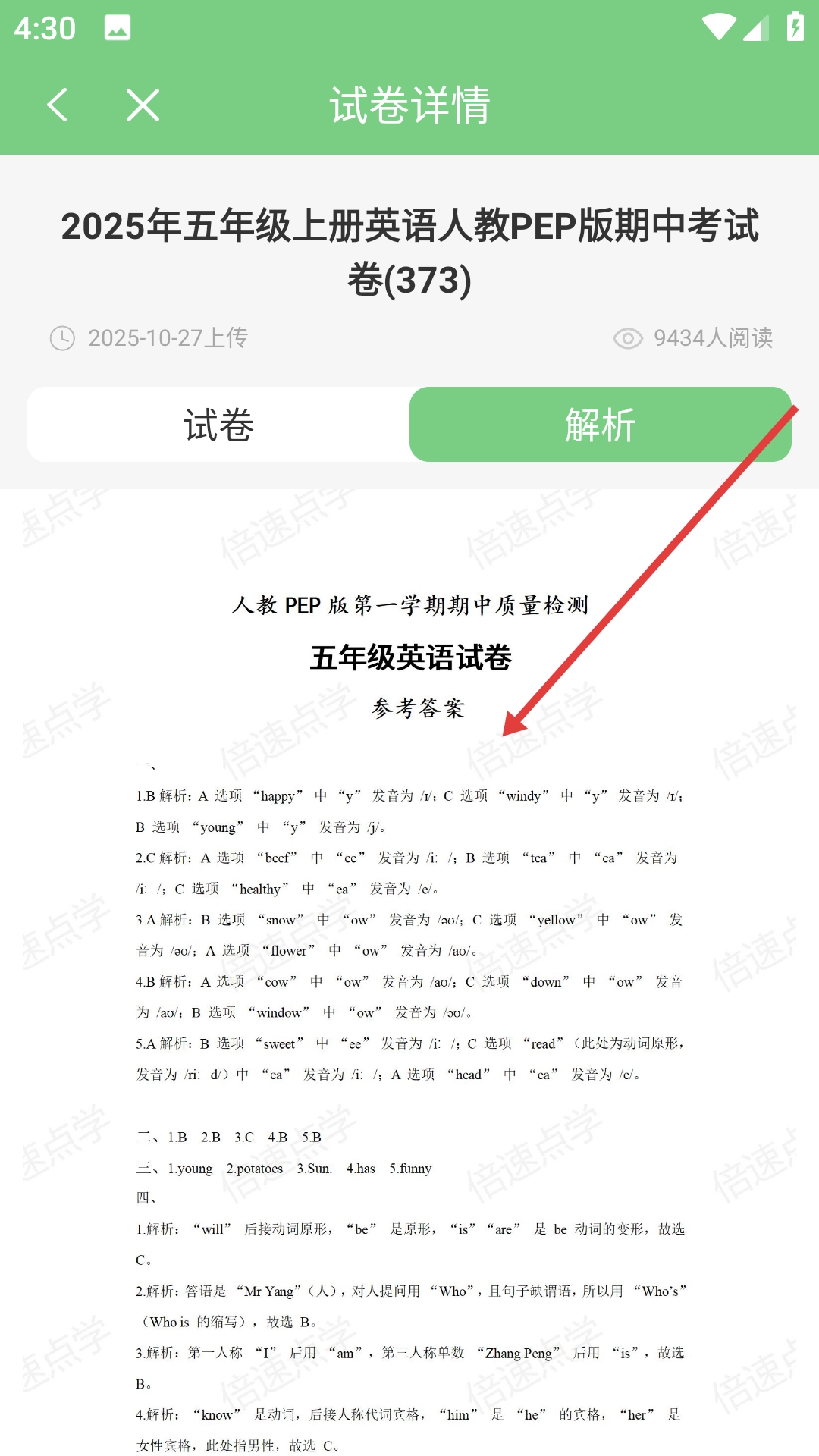3、进入试卷详情页面后,点击【解析】选项,即可查看试卷的解析内容。