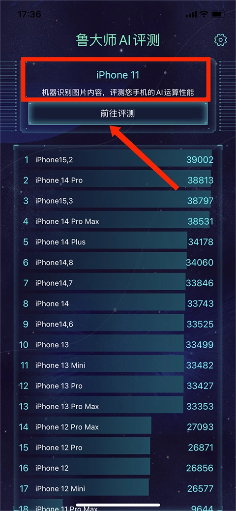 1、启动软件进入主界面后,能看到当前显示的【手机型号】与【测评排行榜】,接着选择【前往测评】这一选项。