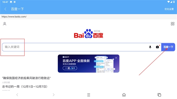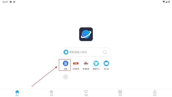 在浏览器首页,点击【百度】快捷入口,进入百度搜索页面后,就能快速使用搜索功能了。