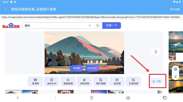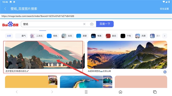 3、打开百度图片搜索页面后,找到你想要的壁纸缩略图并点击,进入该壁纸的详情页面,为接下来的操作做好准备。