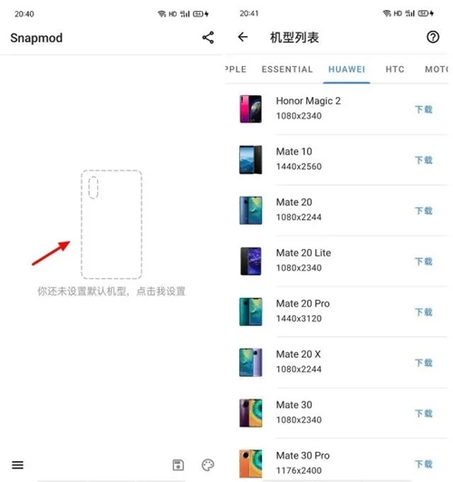打开工具后,点击界面中间的手机图标,就能进入机型选择页面。Snapmod提供的机型模板十分丰富且全面,几乎覆盖了主流手机品牌,像国内的华为、小米、OPPO、VIVO、魅族、真我等,海外的苹果、三星、索尼、谷歌等品牌也都支持。