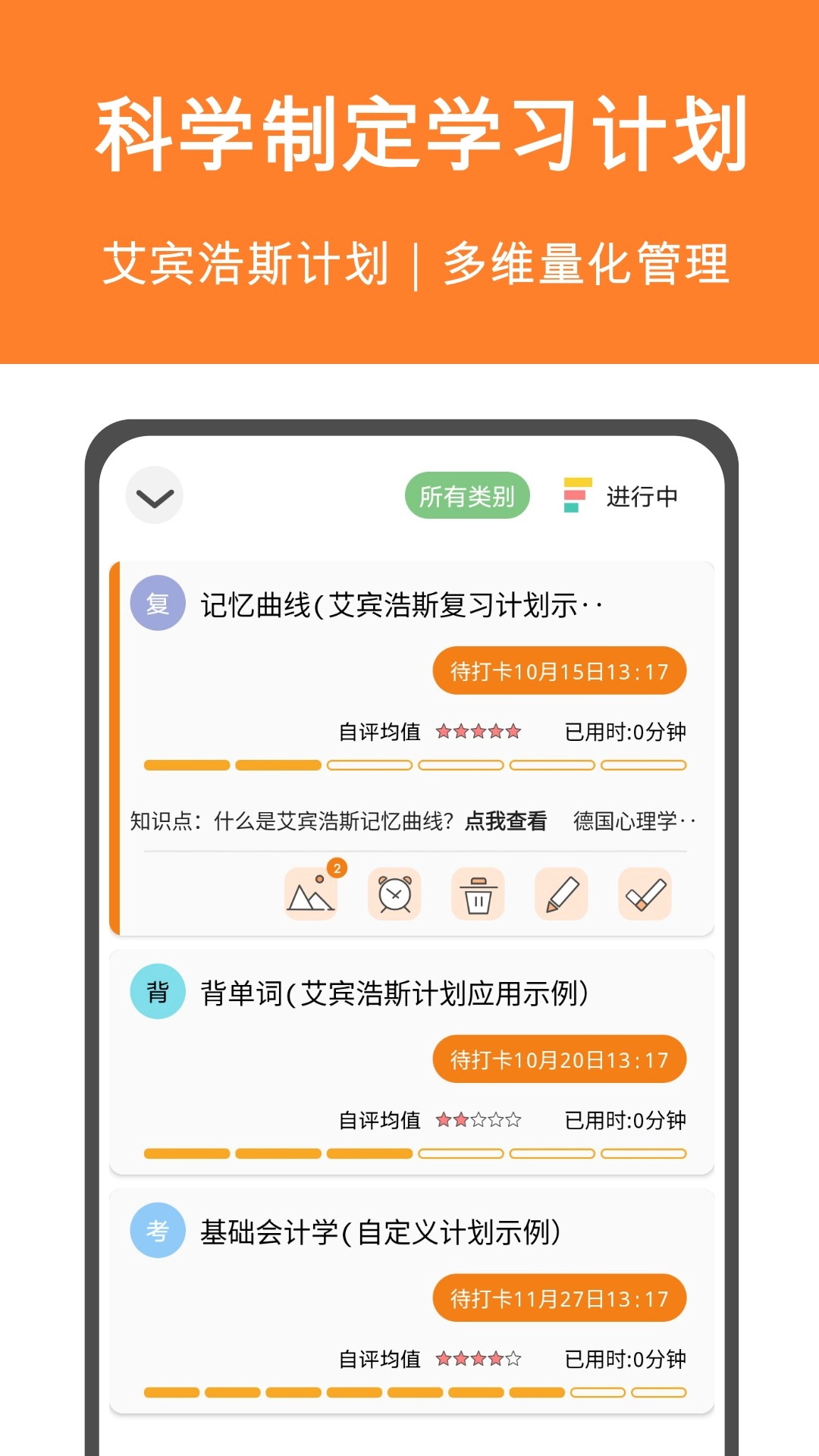 借助艾宾浩斯记忆法,迅速批量规划学习与复习计划,提升自我学习效率,强化长期记忆。具备计划任务计时、自我评估、提醒等核心功能,还支持桌面小部件快捷打卡,助您全身心投入计划的执行。