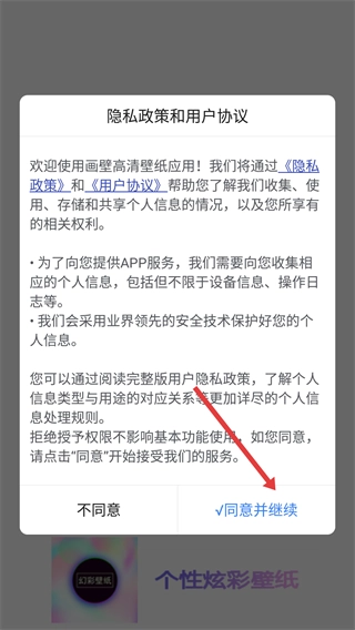 1、启动【画壁高清壁纸】应用后,会弹出【隐私政策和用户协议】的提示窗口,点击【同意并继续】按钮即可进入应用主界面。