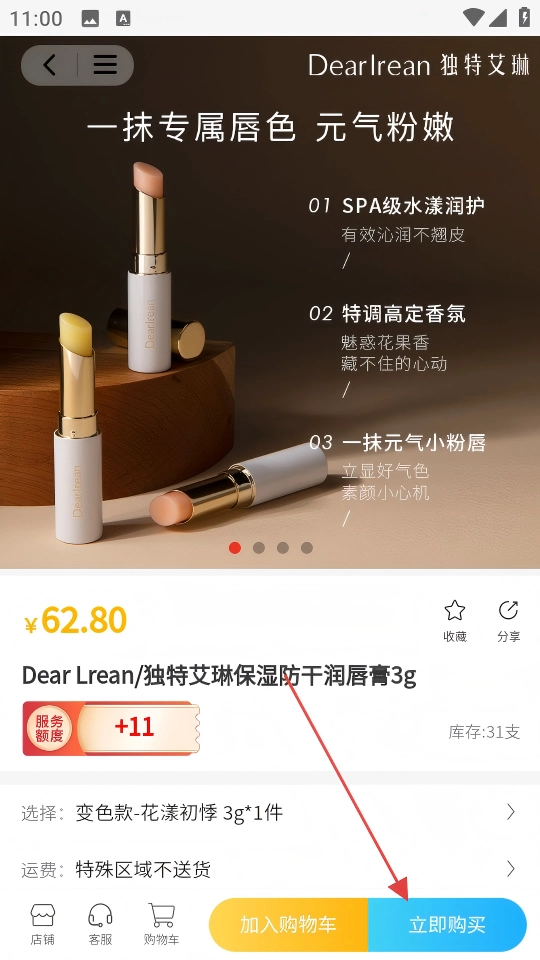 4、进入商品详情页面,浏览完商品信息后,点击【立即购买】按钮,即可开展该美妆商品的购买流程。