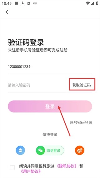 4、在页面填写完账号后,点击【获取验证码】按钮,输入验证码后点击【登录】按钮,即可完成登录操作。