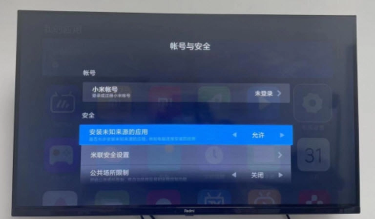 2、开启小米电视后,依次点击【电视设置】-【账号与安全】-【安全】选项,把【安装未知来源】的应用权限设置为“允许”状态;
