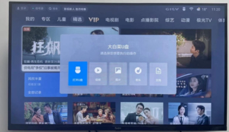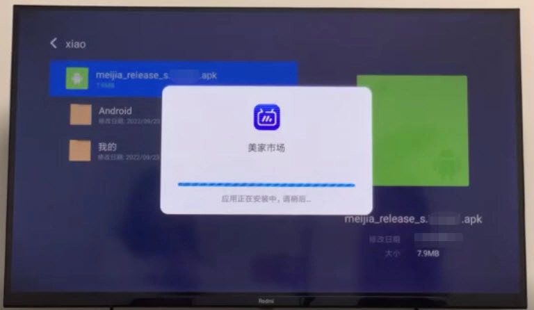 3、把U盘插入小米电视的USB接口,电视识别到U盘后会弹出提示窗口,此时选择“打开U盘”选项,在U盘中找到美家市场的安装包文件,点击进行安装操作,等安装完成后,打开美家市场就能正常使用了。