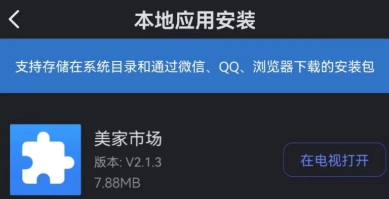 5、连接成功后,在小米电视助手的【本地应用】里找到之前的美家市场安装包,点击“在电视打开”就能使用美家市场应用了。