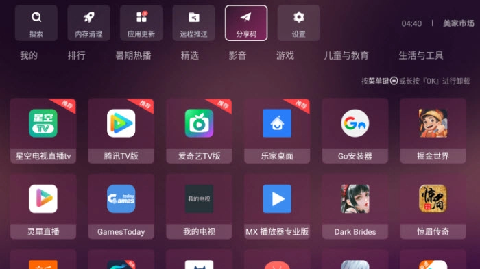 通过美家市场,你能在自家的智能电视、电视盒子等设备上安装各类实用应用,像电视直播、影视类软件都能轻松获取。平台有着丰富且细致的软件分类,方便你快速定位到需要的应用。这里的所有应用都是本地的,安全绿色没有风险,借助它,你可以获得更优质的看电视体验。