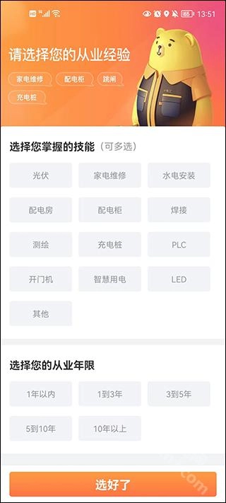 1、电工师傅在使用软件时,可以选择自己的专业技能和行业经验,以便系统分配合适的订单。
