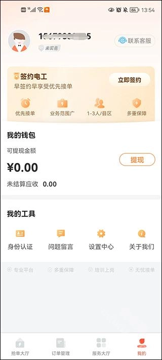 5、在“我的”界面,可以查看可提现金额,并与平台签约以享受优先接单特权。