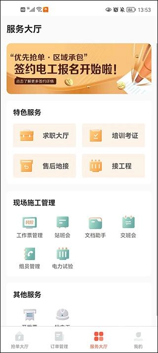 4、服务大厅提供求职、培训、接工程等服务,还有工作票管理、站班会、文档助手等功能。