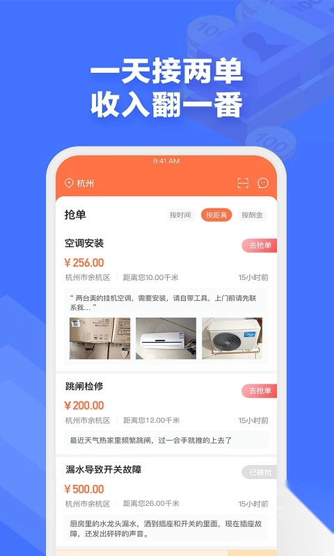 2、在首页的抢单大厅,有各种价格的任务订单可供选择接单。