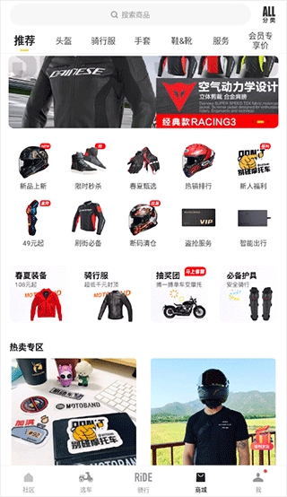 4、商场模块提供丰富的骑行装备,包括骑行服和头盔等。