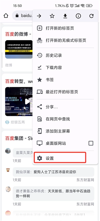 1、进入首页并点击右上角的三个点图标,并点击“设置”选项。