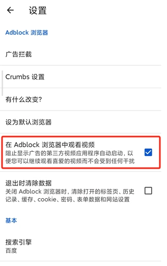 2、在设置菜单中勾选“在Adblock浏览器中观看视频”选项。