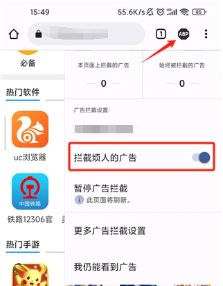5、点击ABP图标,开启“拦截烦人的广告”即可享受的浏览体验。