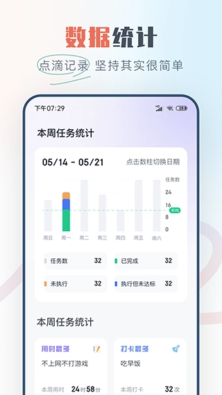 记录打卡天数与目标完成情况,每日坚持,做更好的自己。