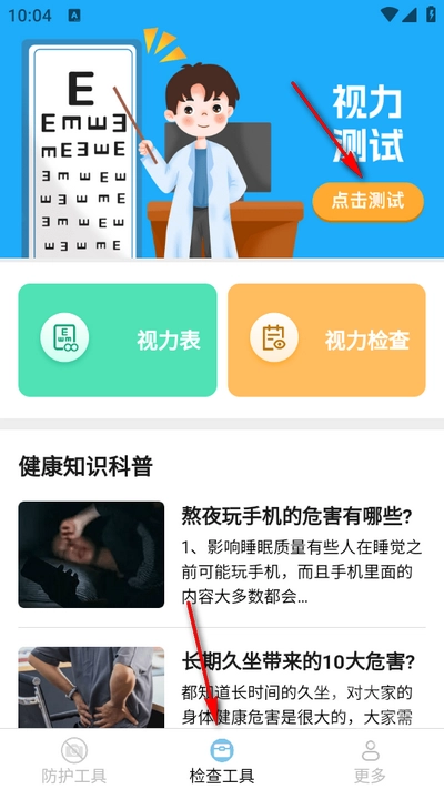 1、点击下方检查工具,再点击视力测试