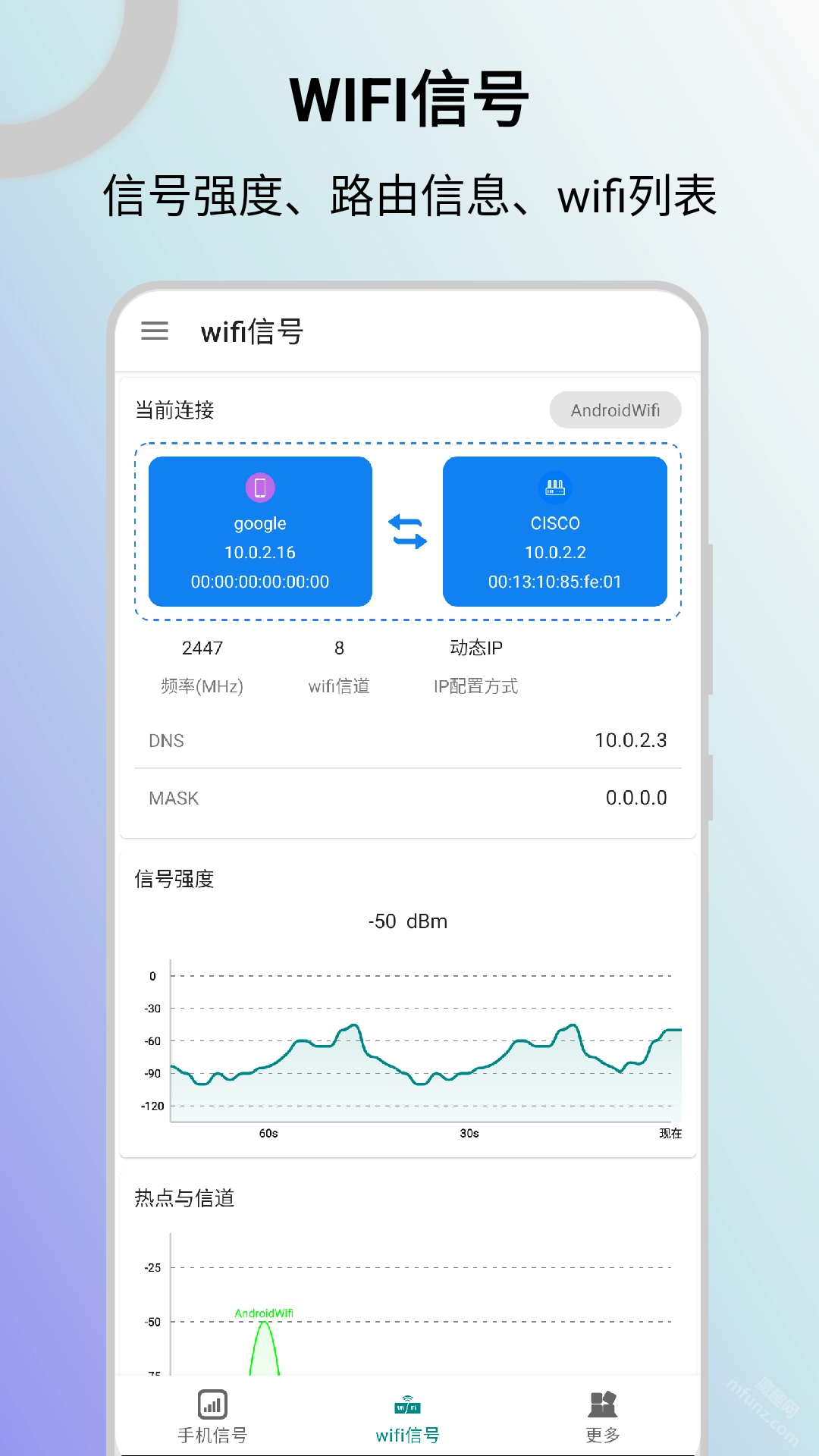 WIFI信号检测功能:可实时监测WIFI信号的强弱情况,并能查询包括信号强度、MAC地址、信道、IP配置、连接速率在内的各类WIFI相关信息。
