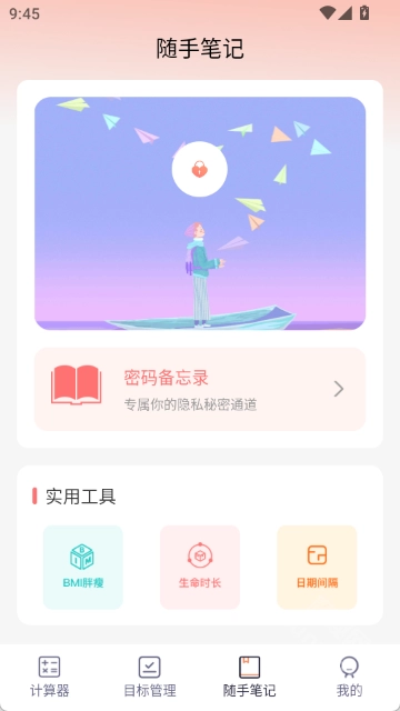 4. 随手笔记支持密码备忘录、生命时长、日期间隔等功能的使用。