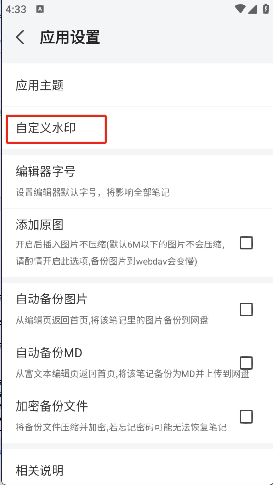 3、在设置中心中点击【自定义水印】功能;