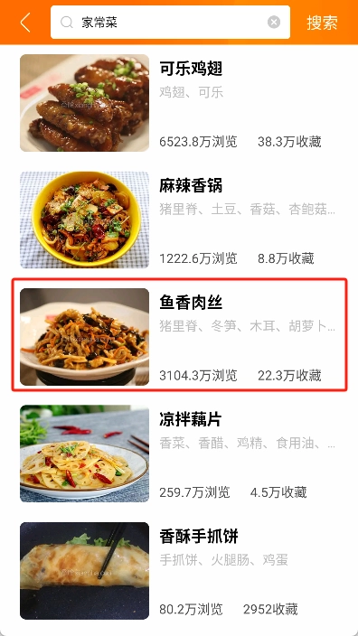 2、进入家常菜类别后,选择一道经典的“鱼香肉丝”菜谱。