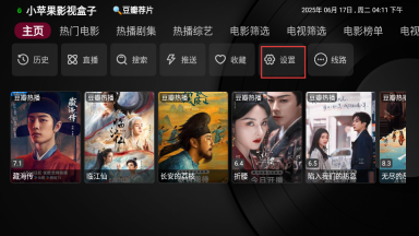 1、打开小苹果影视盒子,在首页找到并点击“设置”。