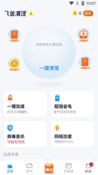 在飞鱼清理大师里,你能对手机开展一系列针对性清洁,既能实现网络加速,又能清理各类病毒文件,软件内还设有不同的天气预报和资讯新闻板块呢。