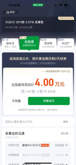 工作人员验完车后,第二天就会给出报价。像我那辆车,瓜子平台的报价是3.75万,我自己设置的拍卖底价是4万,后来有人成功拍下了(不过不是每次都能顺利成交,关键还是得看定价合不合理)