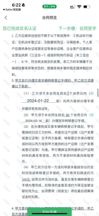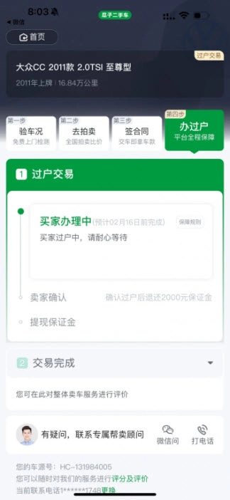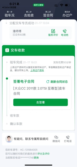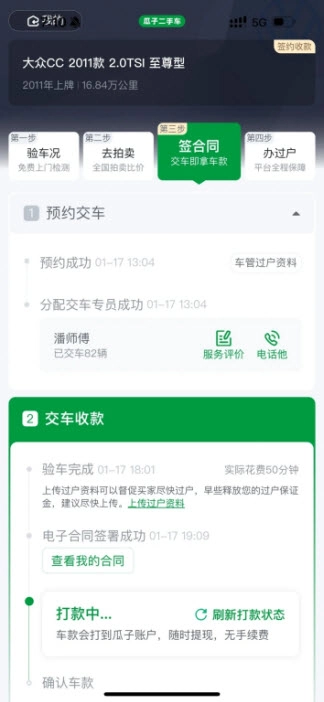 到这一步,瓜子会安排工作人员上门进行复检并签订合同。这个复检过程还挺有意思的,能看到工作人员一直和买家通视频电话,买家让视频看哪里就看哪里。而且也没有小红书上提到的砍价情况,或许是因为买家在外地?不过不管怎样,体验感挺好的,整个流程也很快,电子合同签好后,差不多30分钟就收到钱了。