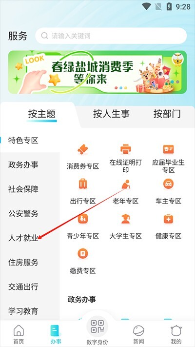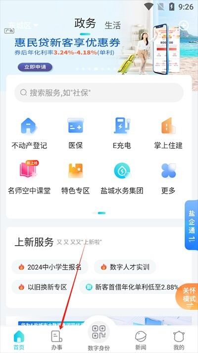 1、打开“我的盐城”软件,完成注册登录后,点击“办事”选项。