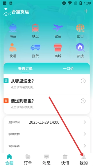 1、打开【合理货运】界面后,在底部导航栏找到并点击【我的】选项,进入个人功能相关页面,以便开展后续操作。