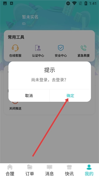 2、进入对应页面后,会弹出【提示-尚未登录-去登录?】的弹窗,点击弹窗里的【确定】按钮,即可进入登录相关流程。