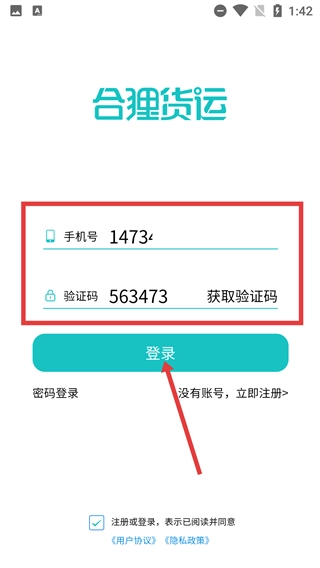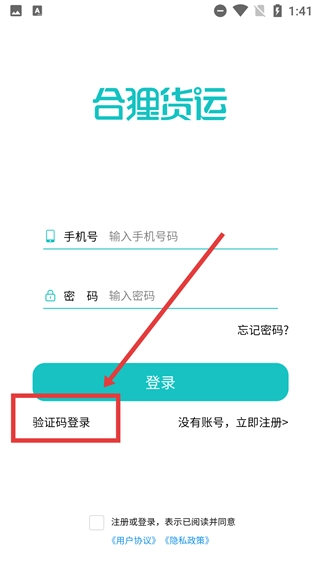 3、在【合理货运】登录页面,找到并点击【验证码登录】选项,切换到验证码登录的操作界面,为后续填写信息做好准备。