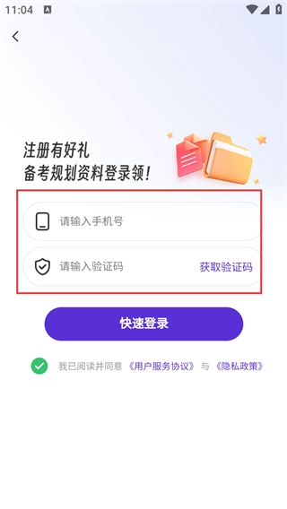 1、在注册页面填写【请输入手机号】和验证码,勾选相关协议后点击【快速登录】按钮,就能领取备考规划资料。