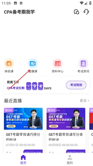 2、进入【CPA备考跟我学】页面后,找到并点击【直播课】选项,即可进入对应的课程板块查看相关直播内容。