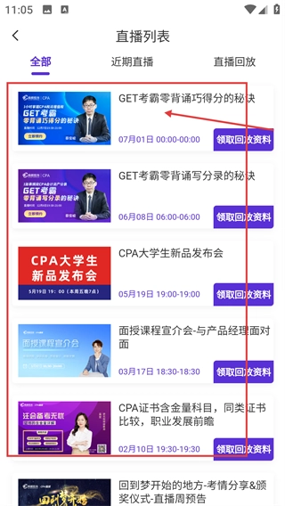 3、进入直播列表页面后,能看到像【GET考霸零背诵巧得分的秘诀】这类课程,点击想要学习的课程即可进入详情页面。