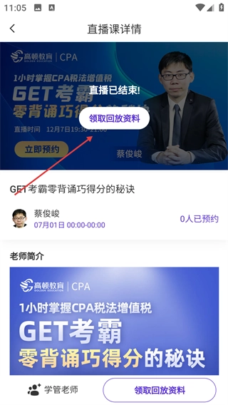 4、在直播课详情页,要是直播已经结束,点击【领取回放资料】按钮,就能得到该课程的回放相关资料。