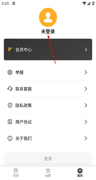 2、点击“我的”进入个人页面,页面显示未登录状态,设有会员中心、举报、联系客服等功能,上方配有对应的状态标识。