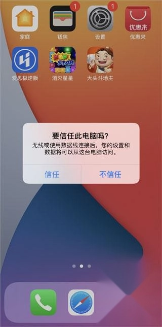 3、当iPhone界面弹出“是否信任此电脑”的询问提示时,选择“信任”选项即可;