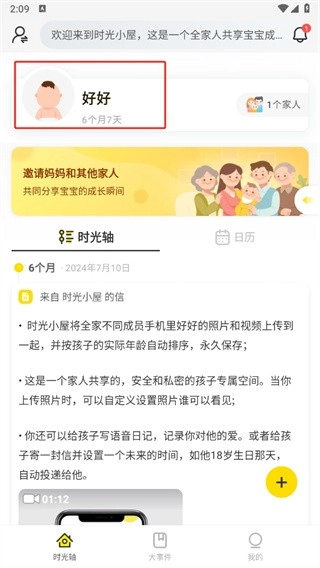 首先打开时光小屋软件,进入孩子时光轴后,点击【孩子昵称】或【头像】。