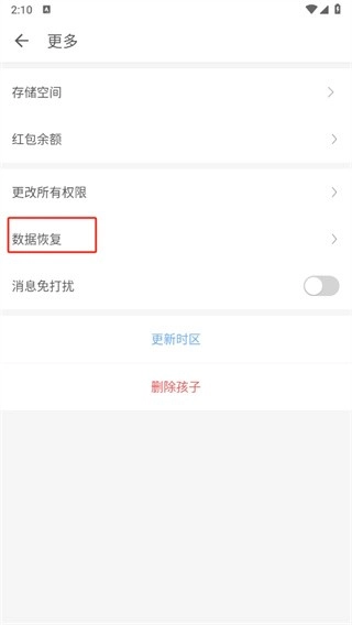 接着浏览更多页面,里面有存储空间、红包余额、数据恢复、消息免打扰等功能选项,我们点击【数据恢复】这一项。