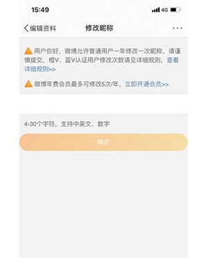 注意:微博昵称仅支持4-30个字符,可使用中文、英文和数字。
