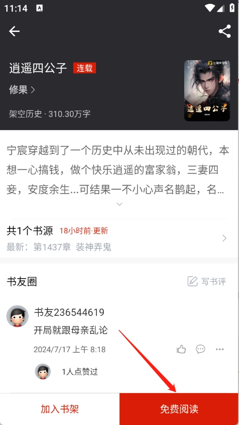 点开喜欢的小说之后进入详情页点击“免费阅读”。