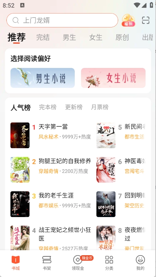 书城页面会依据当下的热度情况,为用户推荐众多热门小说资源。