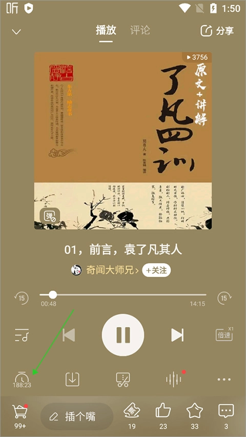 在音频播放页面,点击左下方的闹钟可以开启/关闭。