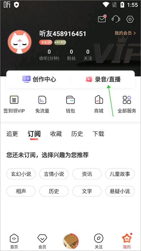 在“我的”页面点击“录音/直播。